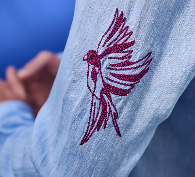 La touche Nodus est une ode aux beaux jours. Broderies tout en finesse et en poésie. Clin d’œil par les superpositions de motifs.