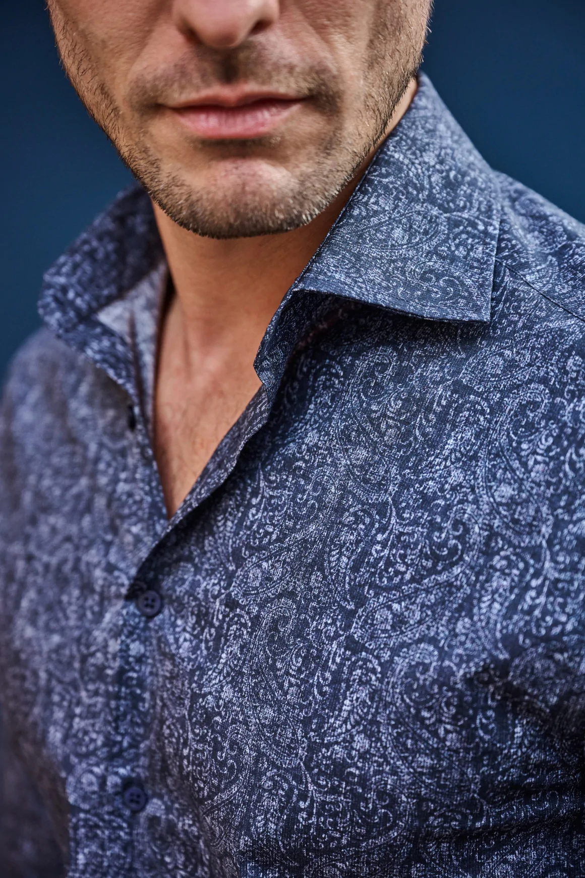 Admirez la finesse du motif cachemire sur fond bleu nuit. Classy.
