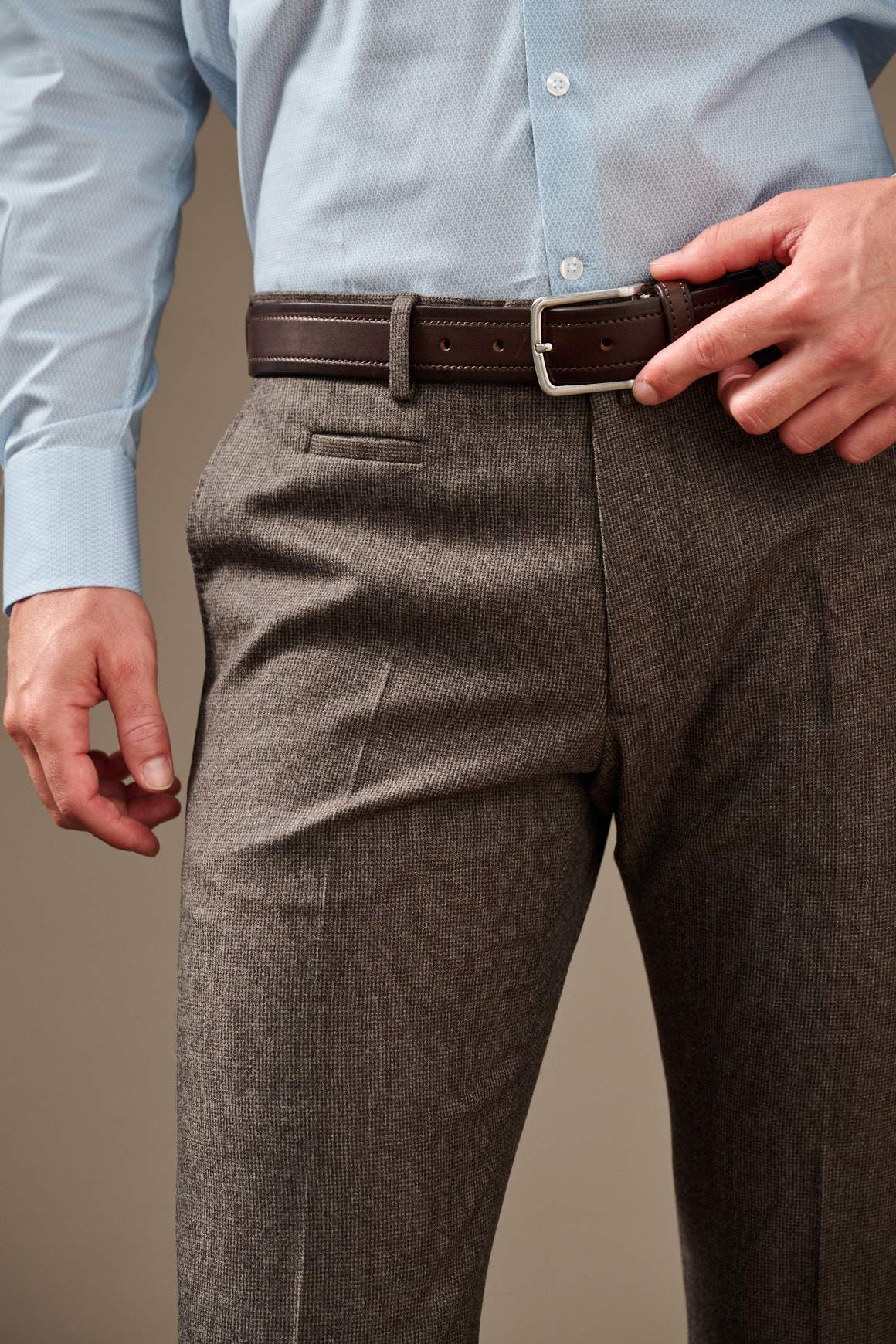 Splendide flanelle extrafine. Le motif "pied de poule" revisité. La douceur et la résistance pour un pantalon de ville d'exception.