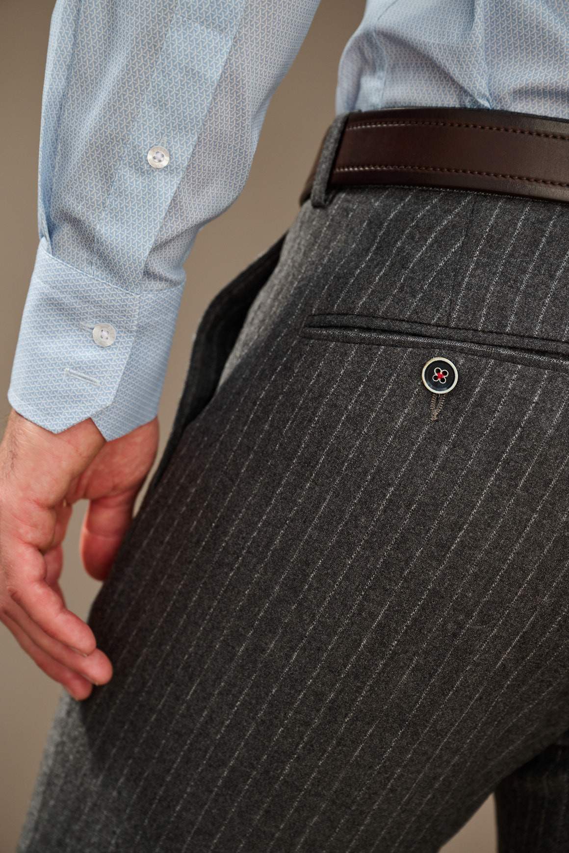 Splendide flanelle extrafine. La rayure tennis en motif. La douceur et la résistance pour un pantalon de ville d'exception.