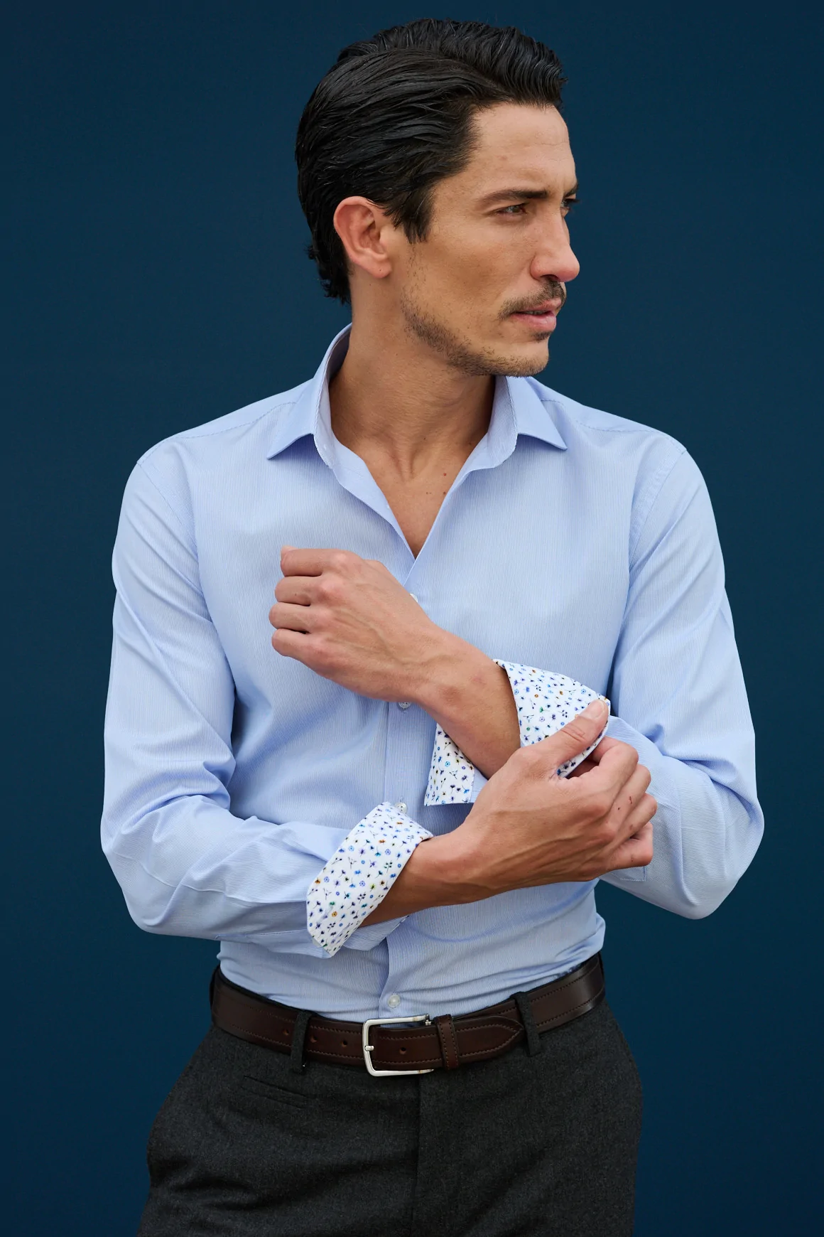 Superbe popeline à très fines rayures. La touche Nodus est caractérisée ici par un motif liberty en pied de col et intérieur de poignets.