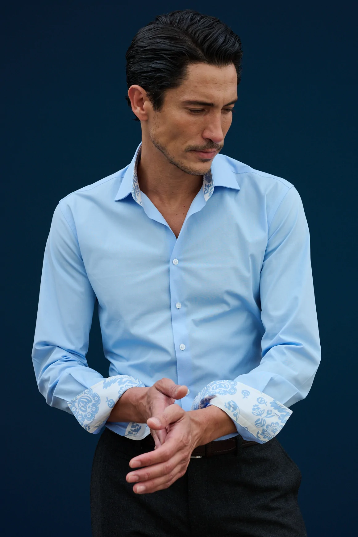 Très belle popeline en bleu azur agrémentée de la touche Nodus. Ici dans un bel imprimé en intérieur de tour de col et en intérieurs de poignets.
