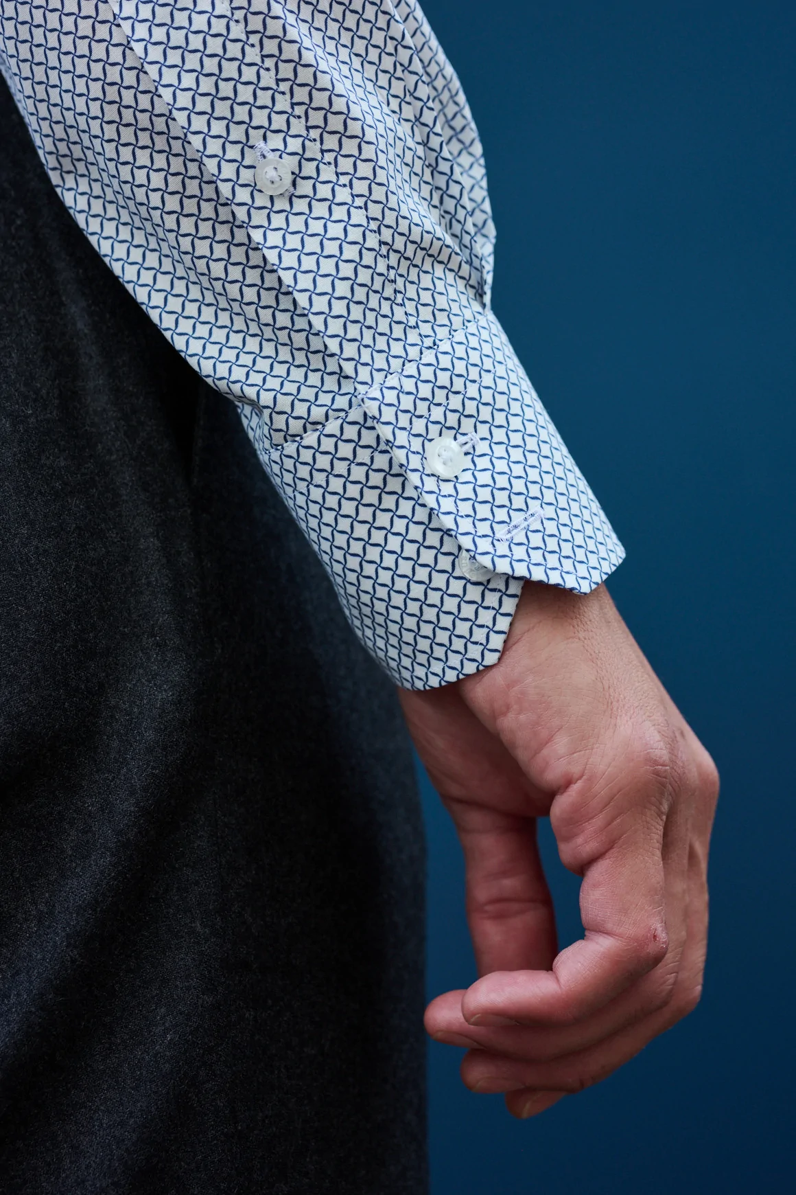Le carré Nodus revisité. Une chemise pleine de caractère et idéale pour accompagner, sans cravate, vos vestes et costumes.