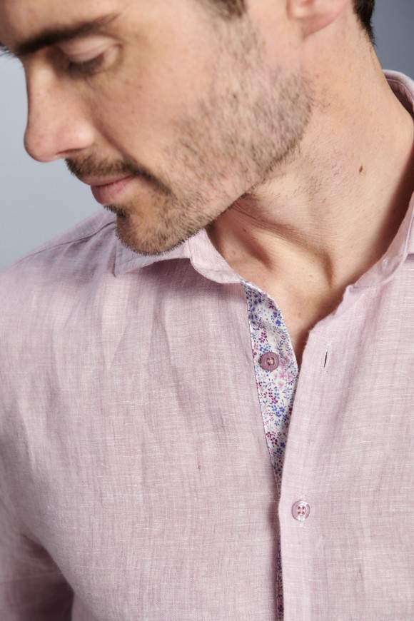 Chemise IBIZA en Lin Vieux Rose. Notre Iconique chemise Ibiza en 100% Lin et en 9 coloris. Liseré fleuri dans les tons pastels qui offre au lin sa fantaisie estivale. Le grain et la fraîcheur. Brides aux manches pour relever le défi.