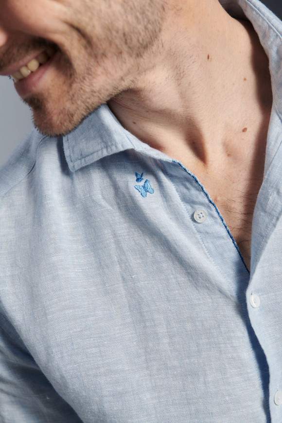 Chemise Butterfly en Lin Bleu ciel. Bleu du ciel sans nuage. On y voit un vol de papillon entre les ifs et les cyprès. La pastèque est au frais. Plein été. Il fait chaud. Mais le lin garantit la fraîcheur.