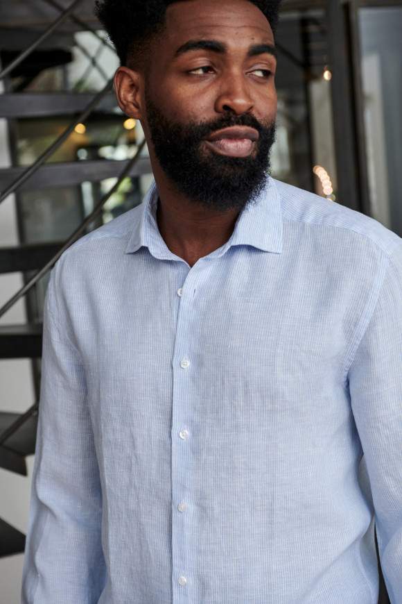 Chemise en Lin. Le must classique et classy de la saison estivale . La rayure azur et blanc à associer avec un chino beige , navy ou blanc et le tour de l'élégance est joué. le sans faute absolu .