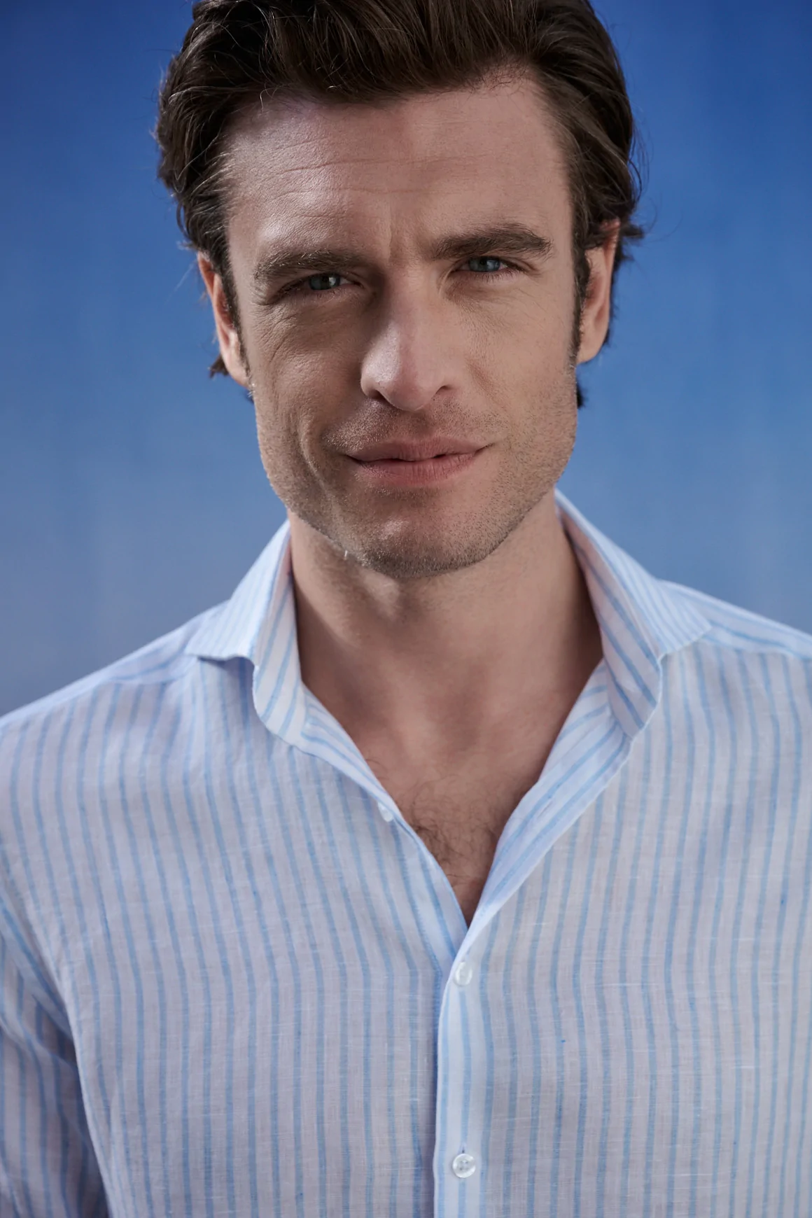 Nouveauté dans notre gamme de Lin. Fond bleu ciel légèrement 'flammé'. Le chic classique revisité.