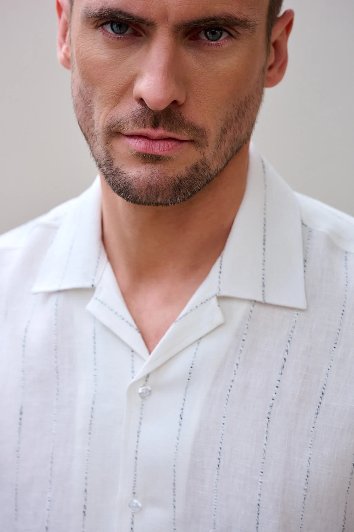 Col ouvert Ibiza sur une superbe toile de lin texturée. À noter l'extrême originalité des fils de rayures à demi cachés.