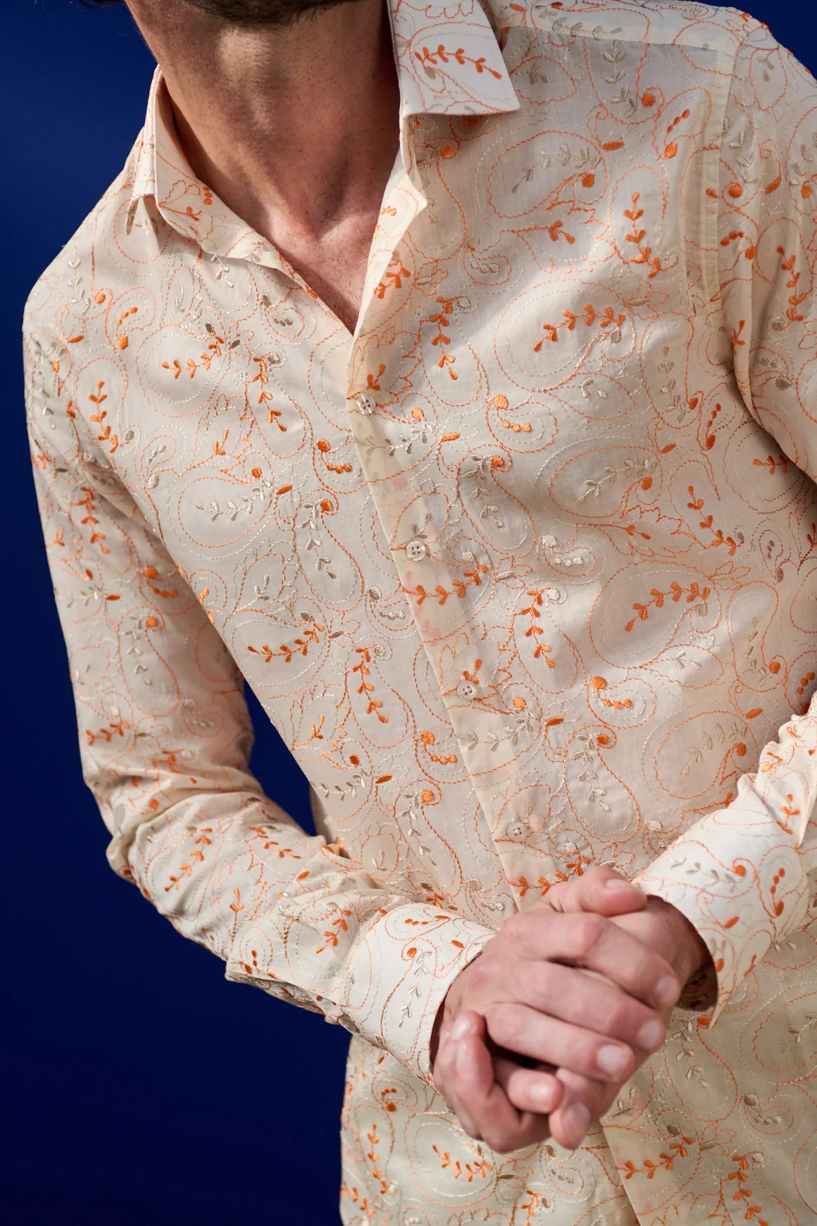 Légèreté du Voile de coton ! Les fines broderies oranges flirtent avec les broderies beiges pour laisser l'impression d'un raffinement extrême. Une histoire à part.
