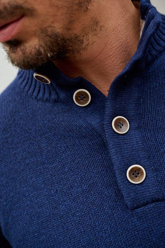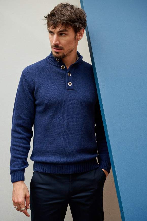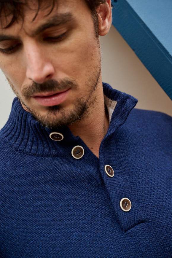 Pull col boutonné Arno en Laine et Cachemire Navy. Mention spéciale pour l'intérieur de col qui se laisse voir pour le plus bel effet.