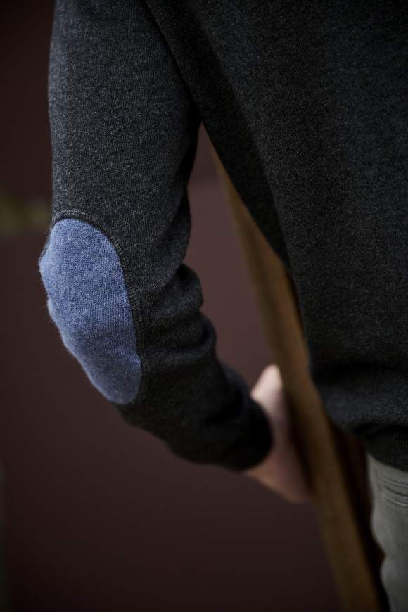 Pull Stefano en Laine Anthracite. Le col rond et ses coudières pour revigorer les souvenirs d'enfance et réchauffer les journées d'hiver.