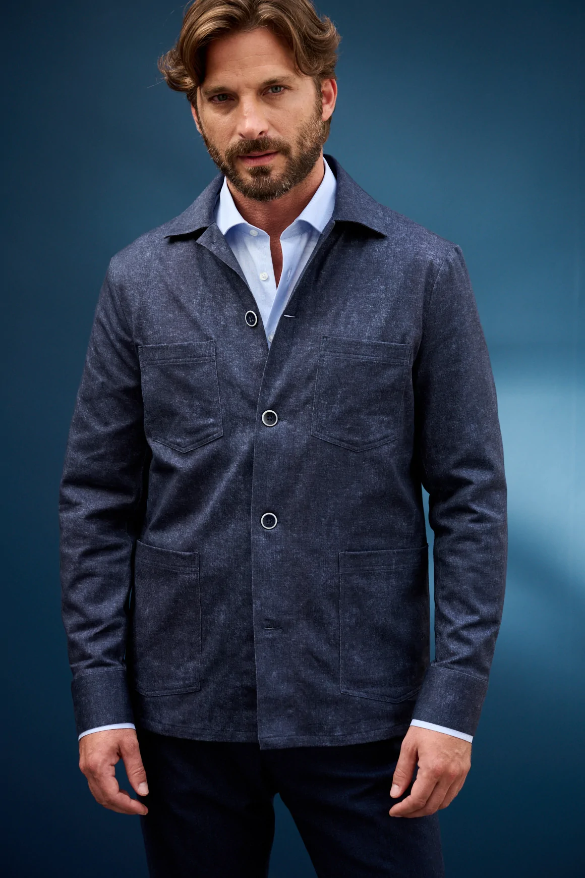 Blazer moderne. Toile Denim en coton stretch imprimée. Aspect "ombre/lumière" à l'extérieur, et impression "motif feuillages" à l'intérieur. La poésie NODUS.